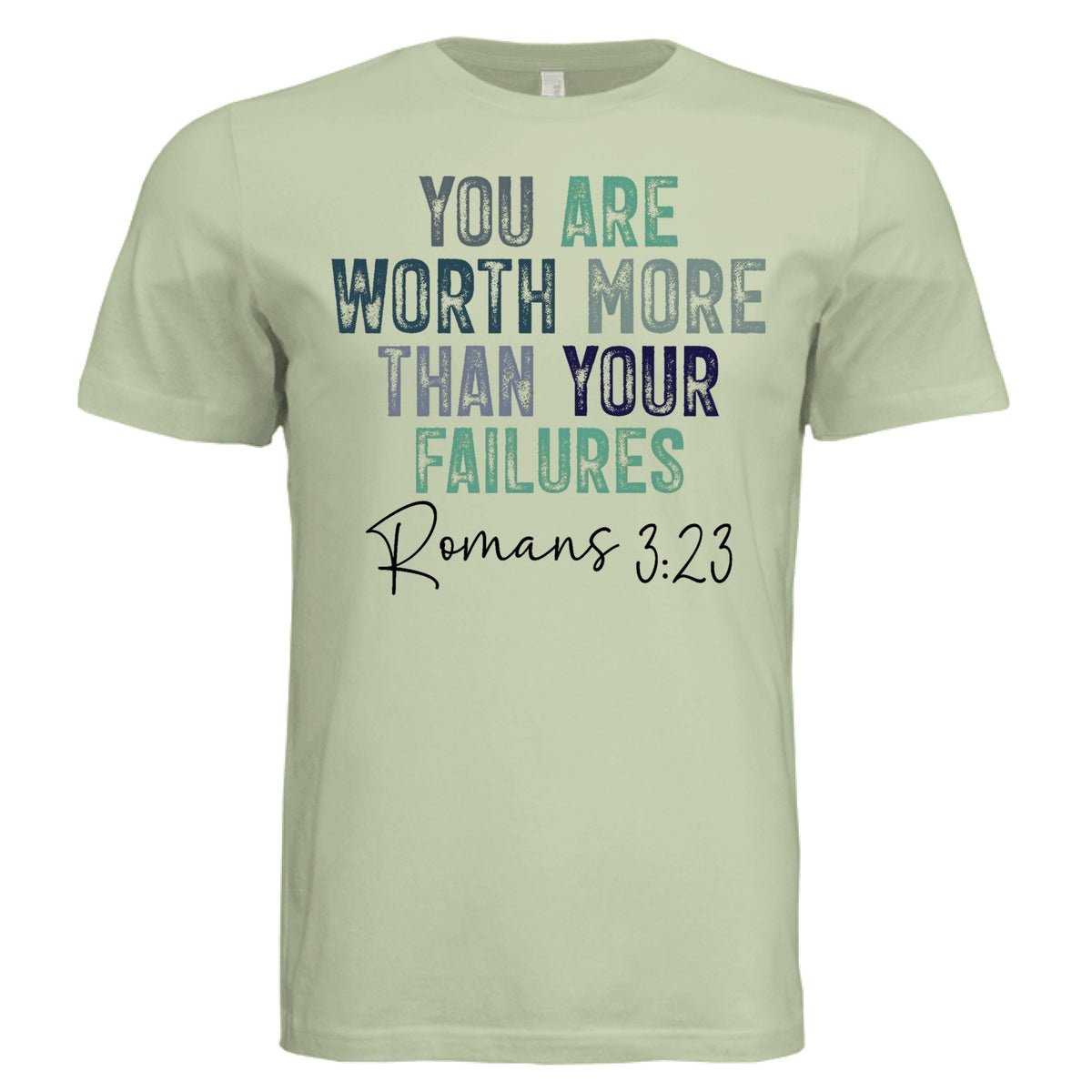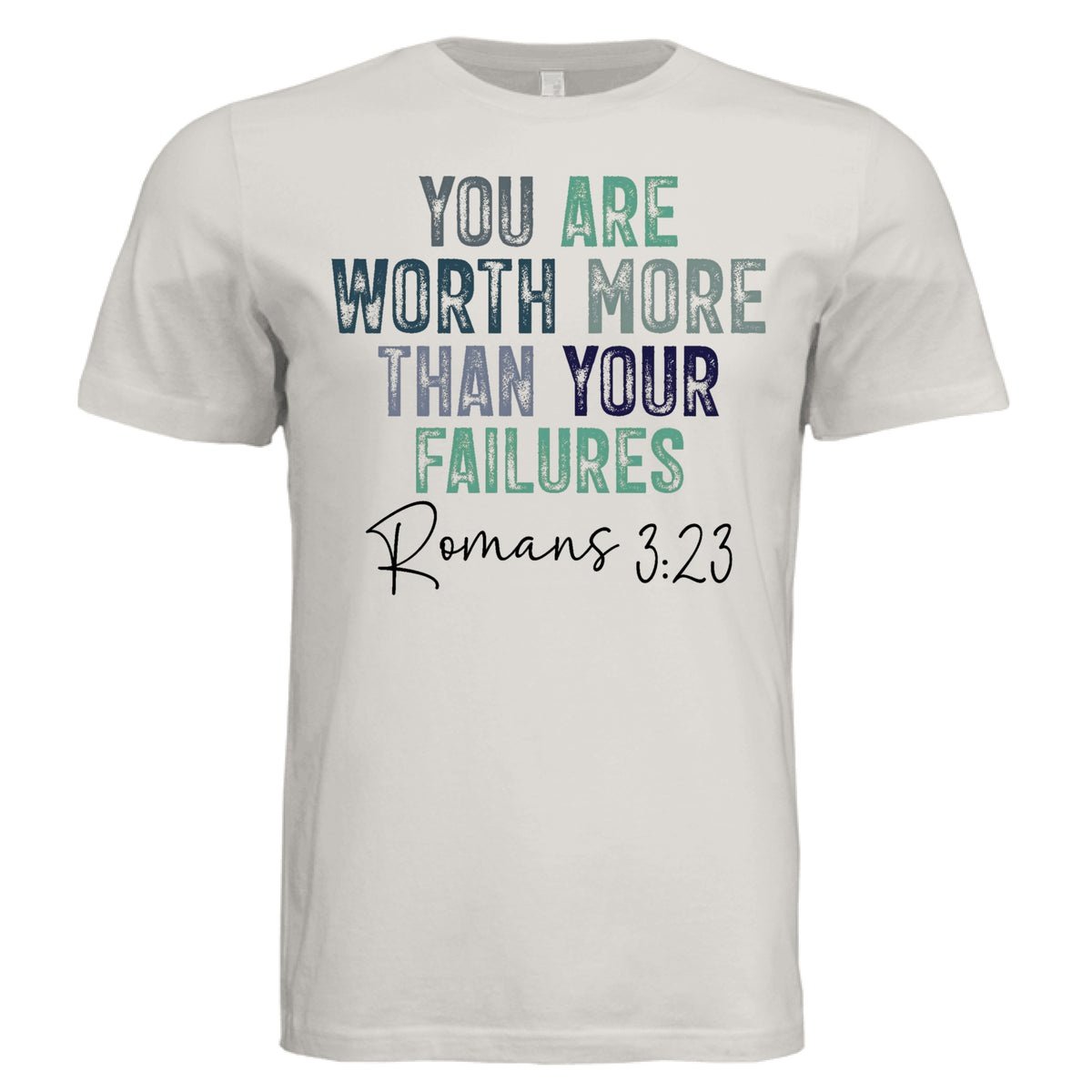 This soft sand-colored tee delivers a bold truth from Romans 3:23 — we all fall short, but our value isn’t found in our failures. It’s found in the One who redeems.