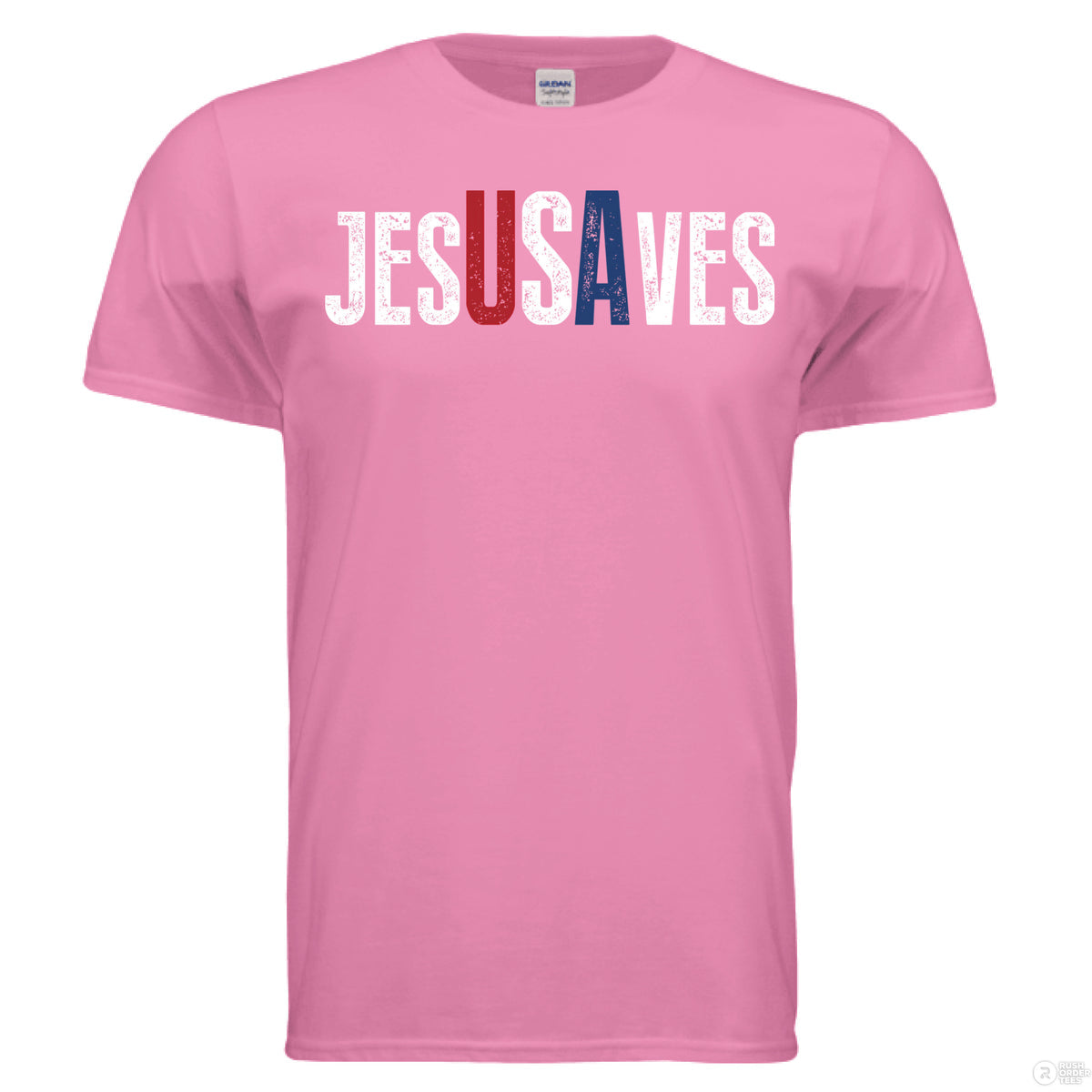 Azalea Christian t-shirt with bold distressed text ‘JESUS SAVES,’ with the letters ‘USA’ highlighted in red, white, and blue for a patriotic message
