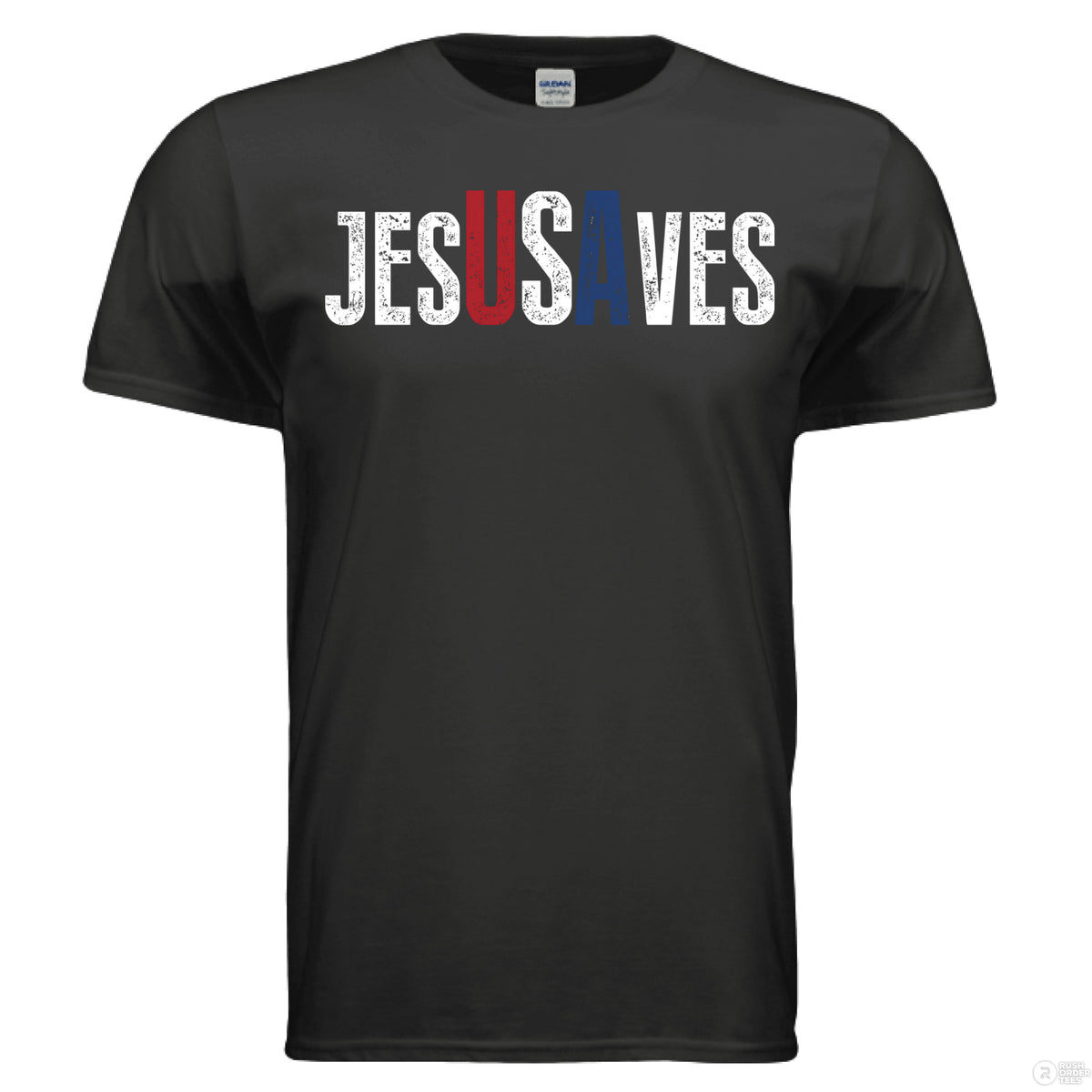 Black Christian t-shirt with bold distressed text ‘JESUS SAVES,’ with the letters ‘USA’ highlighted in red, white, and blue for a patriotic message