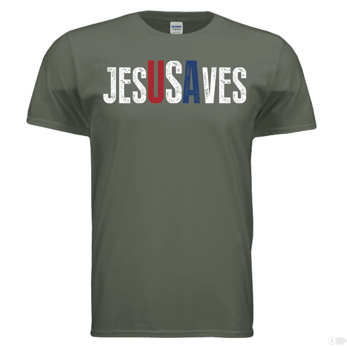 Military green Christian t-shirt with bold distressed text ‘JESUS SAVES,’ with the letters ‘USA’ highlighted in red, white, and blue for a patriotic message
