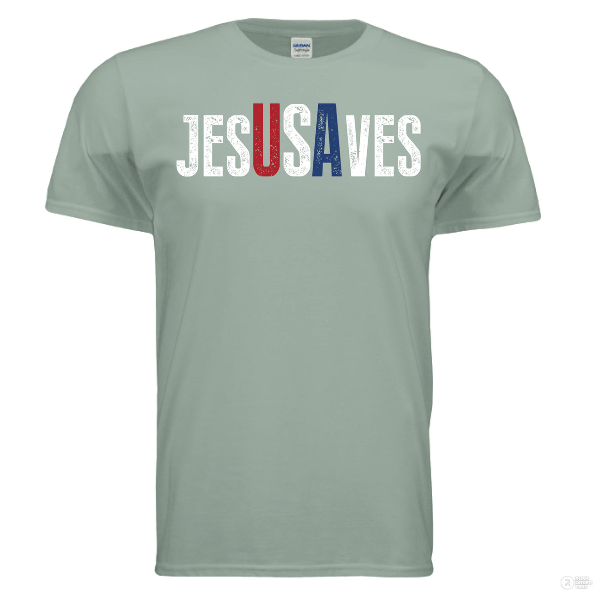 Sage Christian t-shirt with bold distressed text ‘JESUS SAVES,’ with the letters ‘USA’ highlighted in red, white, and blue for a patriotic message