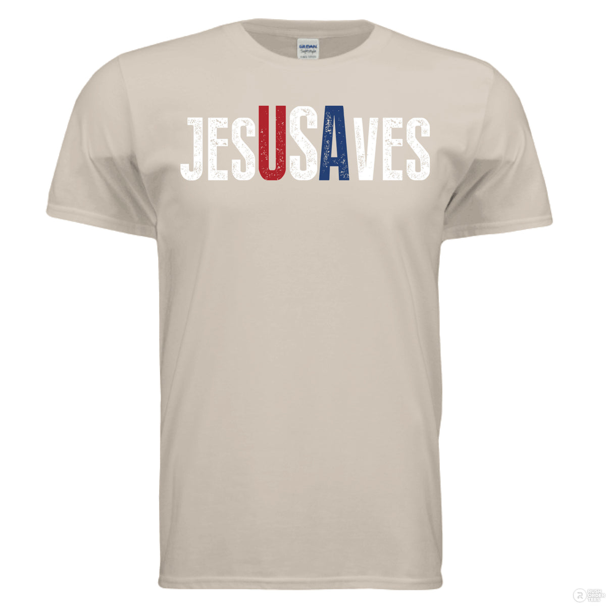 Sand Christian t-shirt with bold distressed text ‘JESUS SAVES,’ with the letters ‘USA’ highlighted in red, white, and blue for a patriotic message