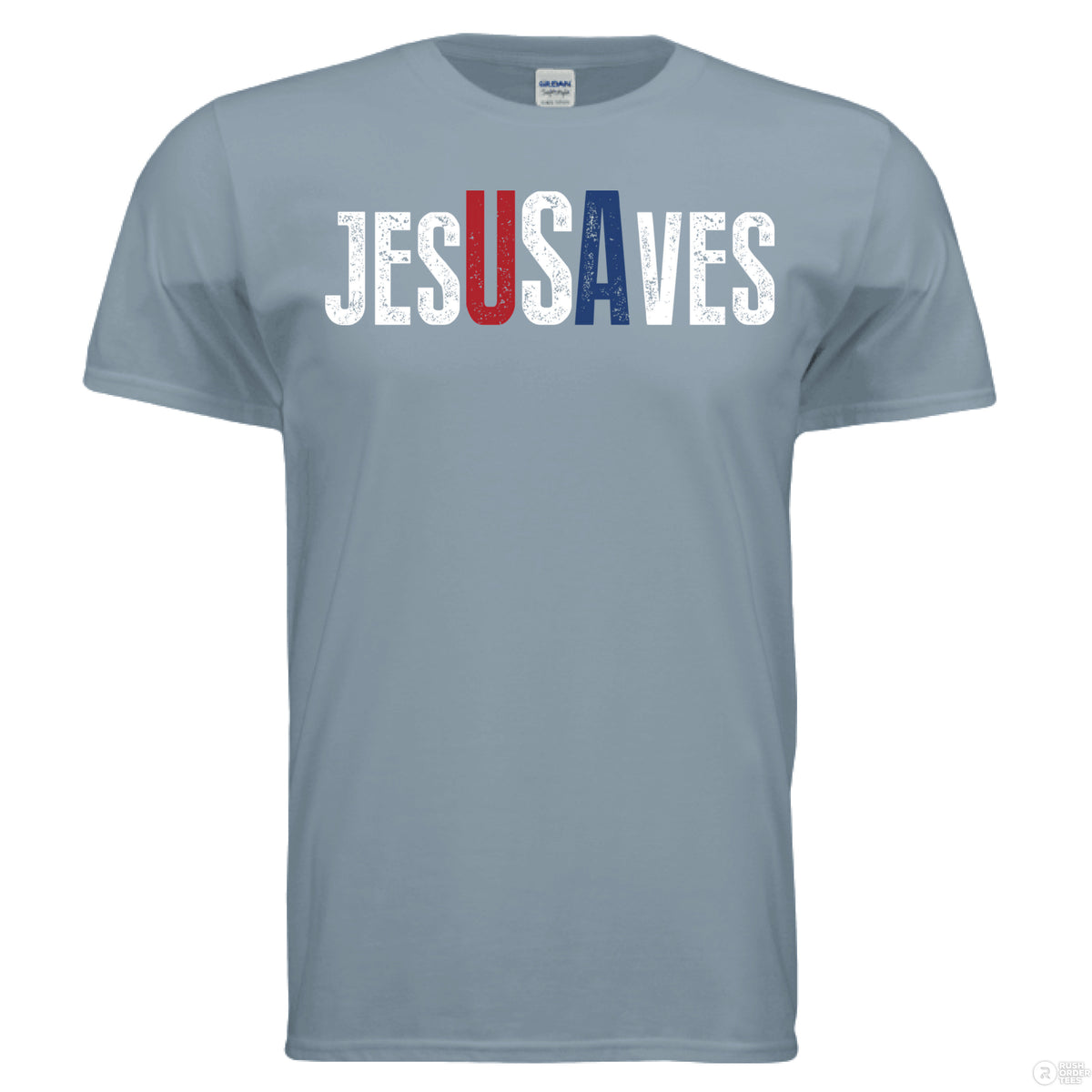 Stone blue Christian t-shirt with bold distressed text ‘JESUS SAVES,’ with the letters ‘USA’ highlighted in red, white, and blue for a patriotic message