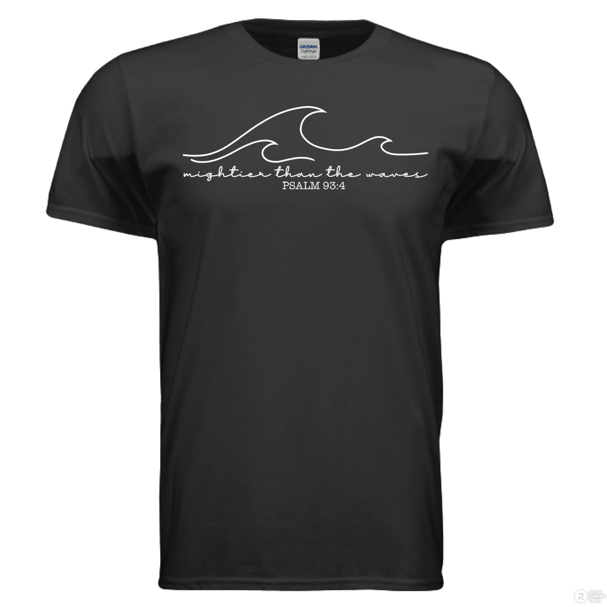 Black shirt with minimalist white wave graphic and Psalm 93:4 verse reading “Mightier than the waves” in handwritten script.