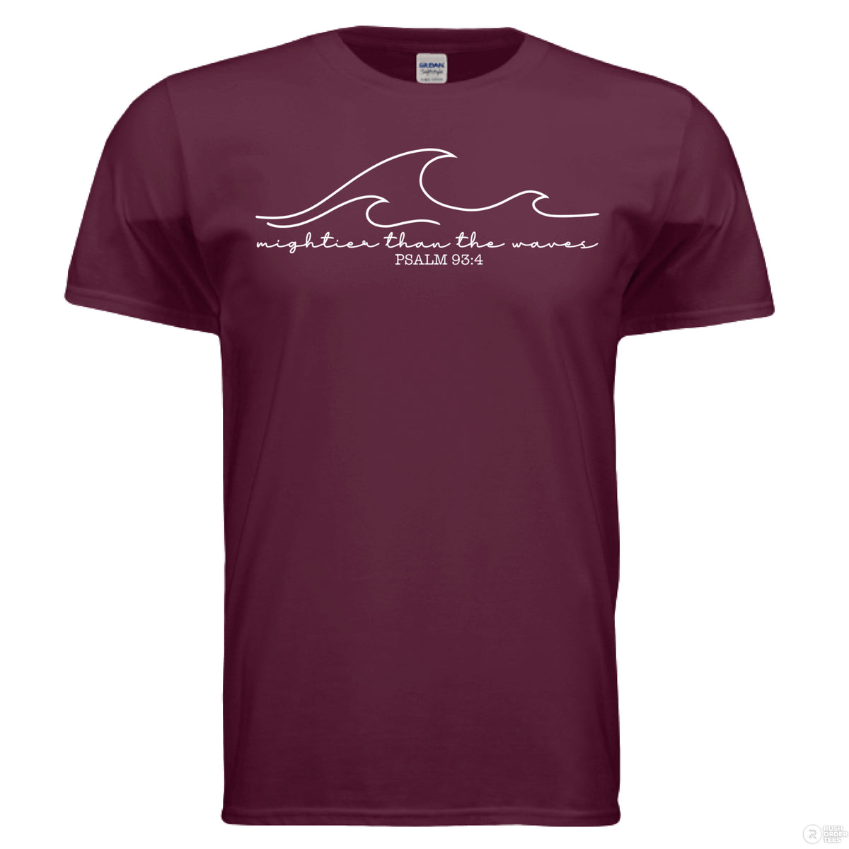 Maroon shirt with minimalist white wave graphic and Psalm 93:4 verse reading “Mightier than the waves” in handwritten script.